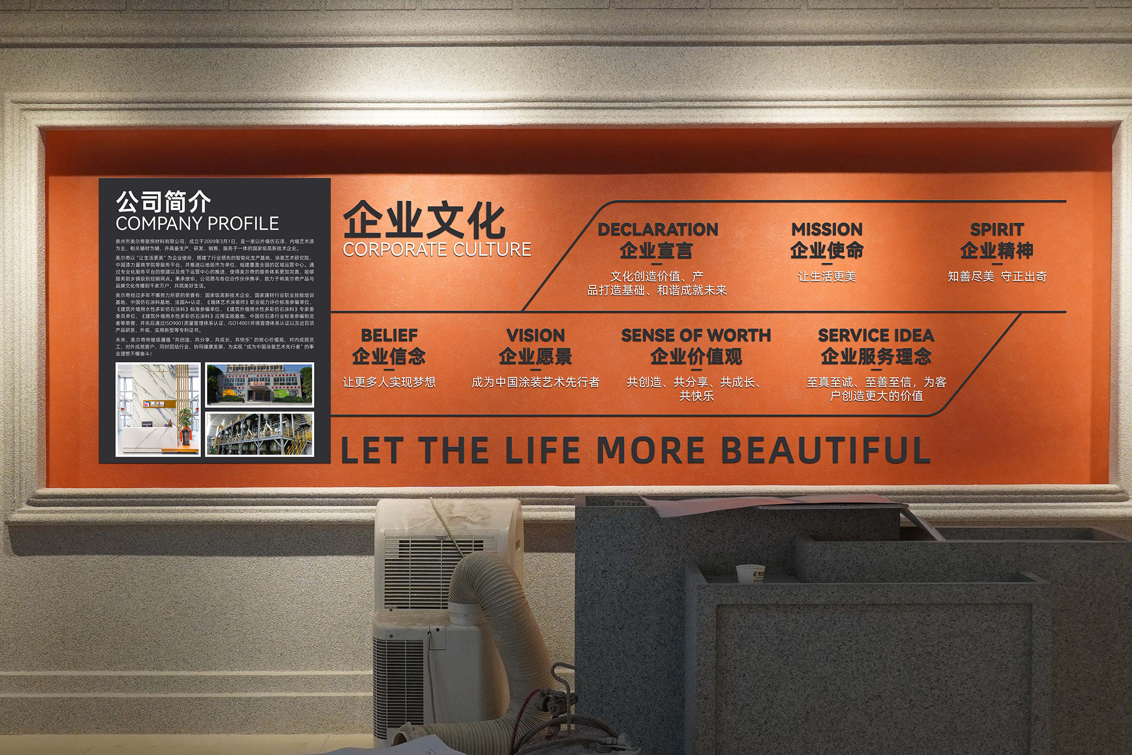 美爾奇經(jīng)過多年不懈努力所獲的榮譽(yù)有:國家高新技術(shù)企業(yè)、國家建材行業(yè)職業(yè)技能培訓(xùn)基地、中國仿石涂料基地、法國A+認(rèn)證、《墻體藝術(shù)涂裝師》職業(yè)能力評(píng)價(jià)標(biāo)準(zhǔn)參編單位、《建筑外墻用水性多彩仿石涂料》標(biāo)準(zhǔn)參編單位、《建筑外墻用水性多彩仿石涂料》專家委委員單位、《建筑外墻用水性多彩仿石涂料》應(yīng)用實(shí)踐基地、中國仿石漆行業(yè)標(biāo)準(zhǔn)參編制定者、公司先后通過ISO9001質(zhì)量體系認(rèn)證、ISO14001環(huán)境體系認(rèn)證等近百項(xiàng)產(chǎn)品研發(fā)、外觀、實(shí)用新型等專利證書。未來美爾奇將繼續(xù)遵循“共創(chuàng)造、共分享、共成長、共快樂”的核心價(jià)值觀,對內(nèi)成就員工,對外成就客戶。同時(shí)團(tuán)結(jié)行業(yè)協(xié)同健康發(fā)展,為實(shí)現(xiàn)“成為中國涂裝藝術(shù)先行者”的事業(yè)理想不懈奮斗!